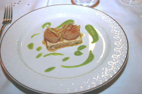 (Salad of scallops and crab with an avocado, green apple and lemon liqueur dressing) -
