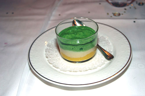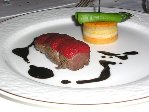 (Rolled fillet of venison 'Grand Veneur' (literally 'master of the king's hunt', a sauce of red wine, wine vinegar, peppers, redcurrant jelly and cream), with a millefeuille of vegetables and asparagus) -