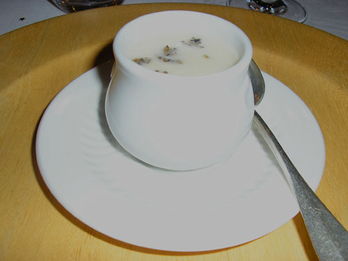 Puree of Ratte potato and white Munster cheese in a half jelly, with a rocket coulis -