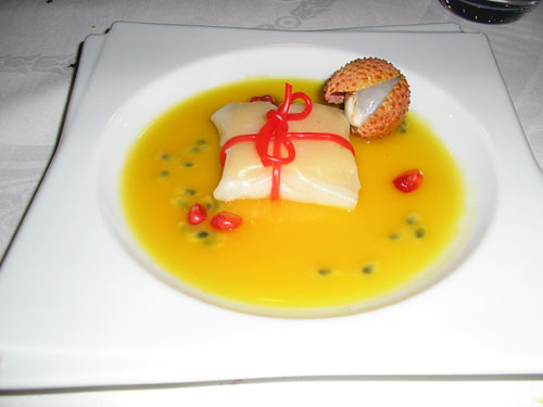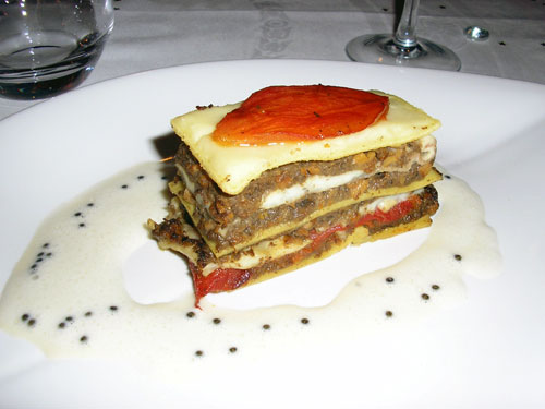 (Sea bass lasagne with tomato petals and a duxelle of girolle mushrooms, with white wine and caviar sauce) -