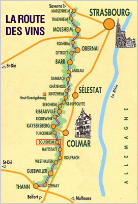 The Route des Vins d'Alsace (Wine route of Alsace) is an approximately 170 km long road, crossing the main wine producing areas of the region, from Thann in the south to Marlenheim near Strasbourg in the north . Use the map on the right to explore the area we covered during our stay. Our base in Eguisheim is at the bottom. The table below details the grapes grown in the region.